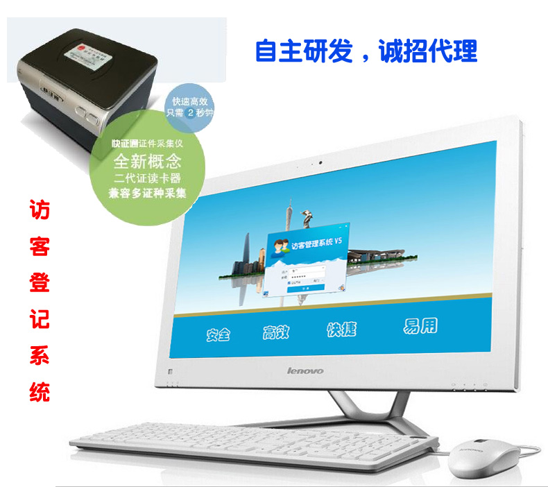 訪(fǎng)客管理系統,訪(fǎng)客登記系統,配聯(lián)想一體機,二合一證件識別儀,支持拍照,快速登記,識別身份證,護照,駕駛證,港澳通行證,軍官證,回鄉證,居住證,行駛證,都可以識別。
