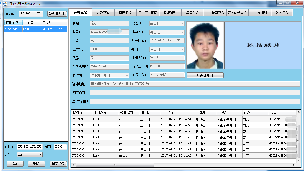 2.   電腦白名單驗證。設備讀取到身份證信息后,發(fā)送給電腦,則電腦軟件負責檢查身份證是否有開(kāi)門(mén)權限。這種方式可以通過(guò)電腦軟件實(shí)現大數據量的白名單驗證,以及其它時(shí)段權限控制。